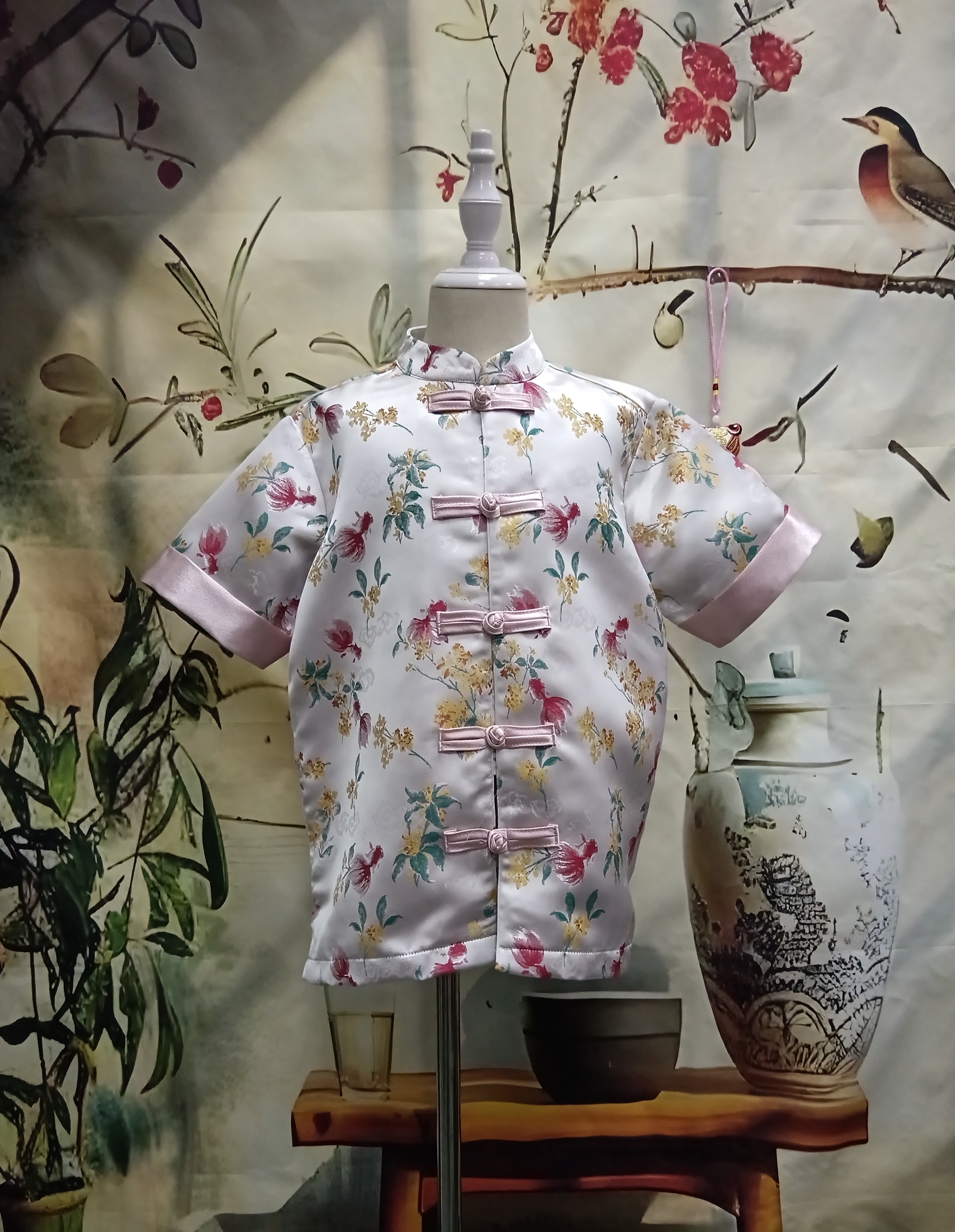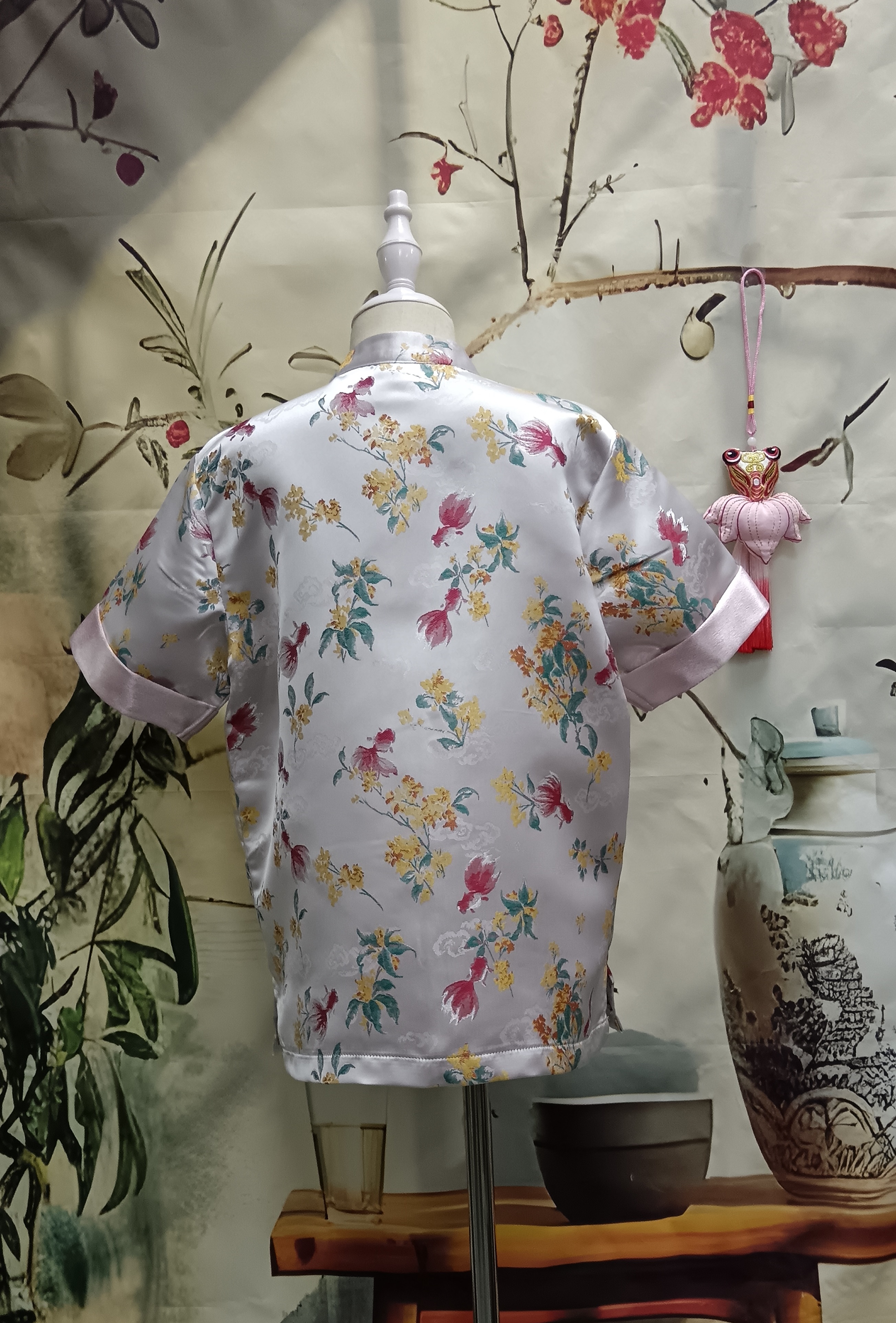 • Traditional mandarin collar with handmade button fastening